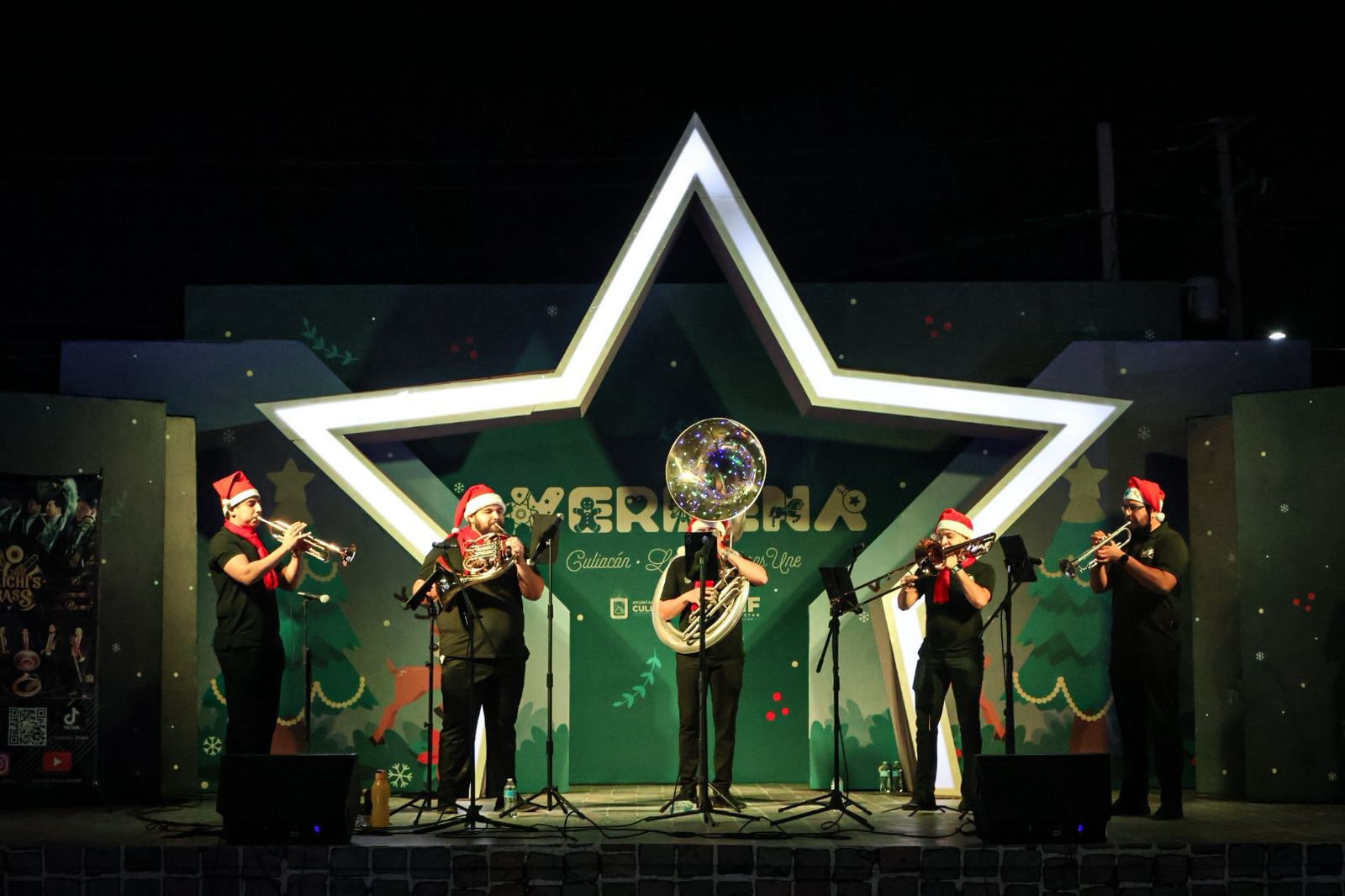 La noche cerró con broche de oro gracias al concierto navideño del quinteto de metales “Culichi Brass”, quienes, con saxofón, tuba y trompetas, interpretaron melodías clásicas como Blanca Navidad, envolviendo la villa en un ambiente cálido y festivo.