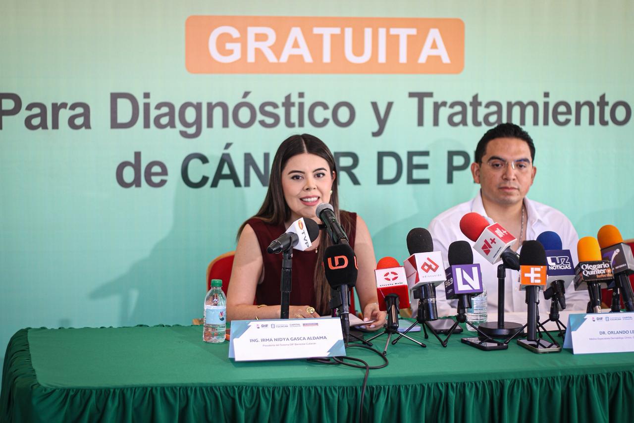 Durante su intervención, la presidenta del Sistema DIF Bienestar Culiacán, Ing. Irma Nidya Gasca Aldama, destacó que el cáncer de piel puede desarrollarse de manera silenciosa, manifestándose a través de manchas, lunares o pequeñas lesiones que suelen pasar desapercibidas, pero que, de no atenderse a tiempo, pueden derivar en complicaciones graves.